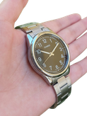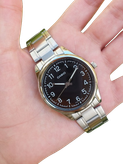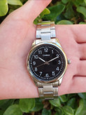 ساعت مچی کلاسیک مردانه CASIO –مدلMTP_V005D، استیل نقرهای با صفحه مشکی و با موتور ژاپن، یک انتخاب ساده، شیک و همیشه پرطرفدار. این ساعت مچی برند معتبر کاسیو (CASIO) با طراحی کلاسیک و بند استیل نقرهای، مناسب آقایانیست که به استایل مینیمال، دقیق و رسمی علاقه دارند.دارای گارانتی ۲ ساله✔️ شرکت پارس پوزیترون است.نمایش زمان به صورت آنالوگ- ۳ عقربه (ساعت، دقیقه، ثانیه)- و بند استیل ضد زنگ با قفل سهتایی. مقاوم در برابر آب تا عمق 50 متر می باشد بدین معنی که برای استفاده در سونا یا هنگام دوش آب داغ و یا غواصی و شنا مناسب نمی باشد.